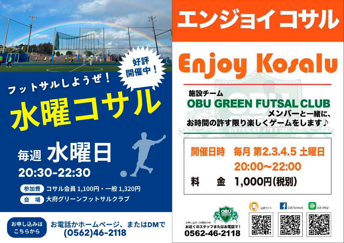 1人でも気軽に参加でき、都合の良い日に楽しめます。集まったメンバーでチーム分けをして、2時間ゲームを行います。土曜エンジョイコサルは施設チームOBU GREEN FUTSAL CLUBメンバーも一緒にプレーします!